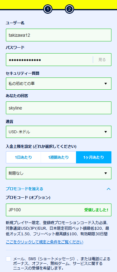 プロモーションコードには「JP100」と出てきます。新規顧客に対してフリーベットの特典が与えられます。貰って損はありません。