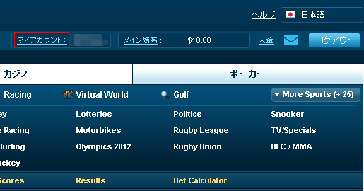 ベットを確認してみます。まずはマイアカウントをクリックします。