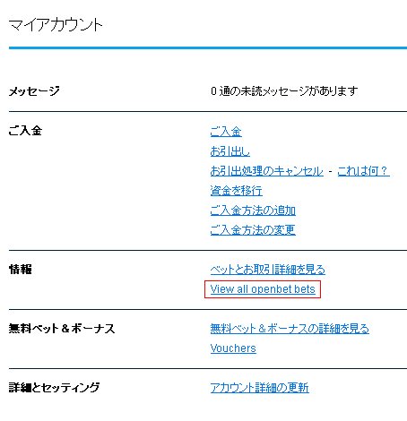 ベットを確認してみます。まずはマイアカウントをクリックします。View all openbet betsをクリックします。そうすると以下の画...