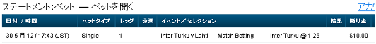 ウィリアムヒルベットの結果を見てみます。まずはベットとお取引詳細を見るをクリックします。そうすると結果が出ています。勝負はInter Tur...