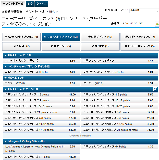 ニューオーリンズ・ペリカンズ対ロサンゼルス・クリッパーズの全てのベットオプションを見てみますとこんな感じです。