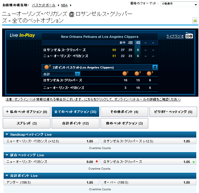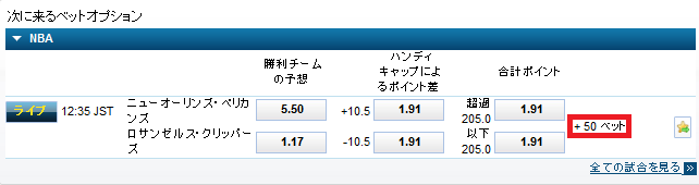 NBAをクリックしますと、いくつか対象試合がありましたが、ニューオーリンズ・ペリカンズ対ロサンゼルス・クリッパーズをピックアップしました。