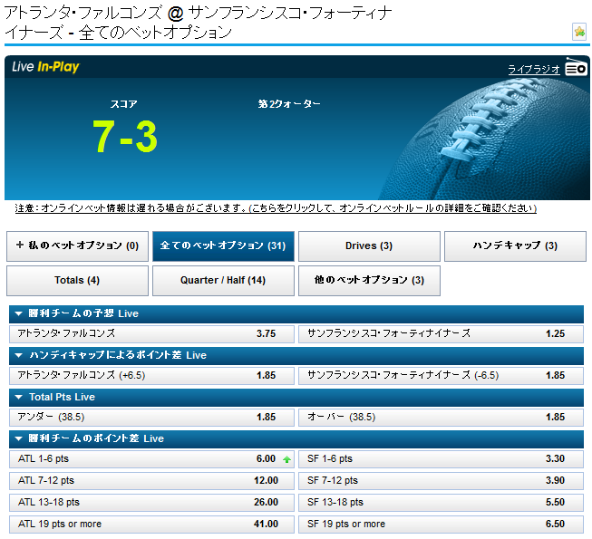 かなり細かく賭けれますので、アメリカンフットボールのベッティングを十分に堪能することができます。