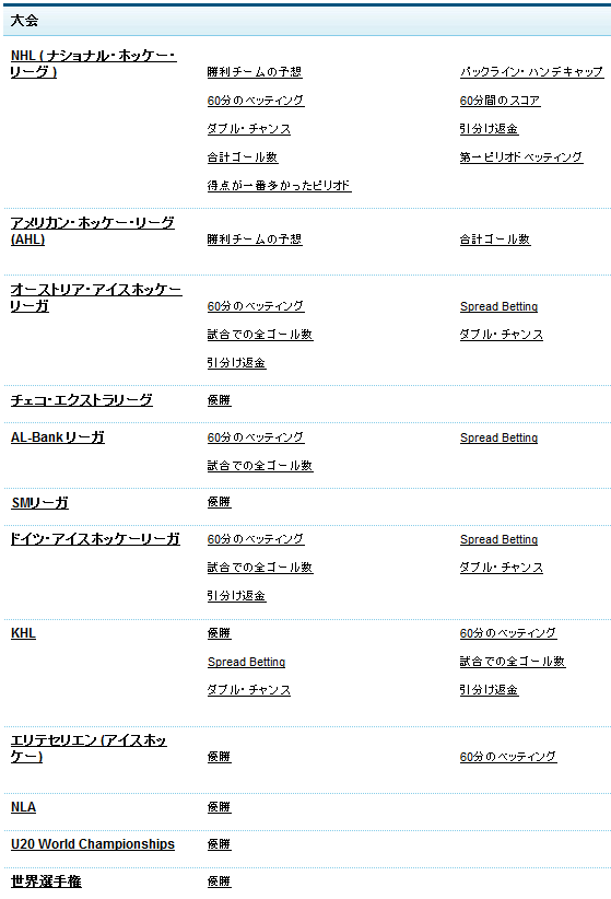賭けれるリーグもNHL(ナショナル・ホッケー・リーグ)、AHL(アメリカン・ホッケー・リーグ)、オーストリア・アイスホッケーリーガ、チェコ・エクストラリーグ、AL-Bankリーガ、SMリーガ、ドイツ・アイスホッケーリーガ、KHL、エリテセリエン、NLA、世界選手権等と豊富です。