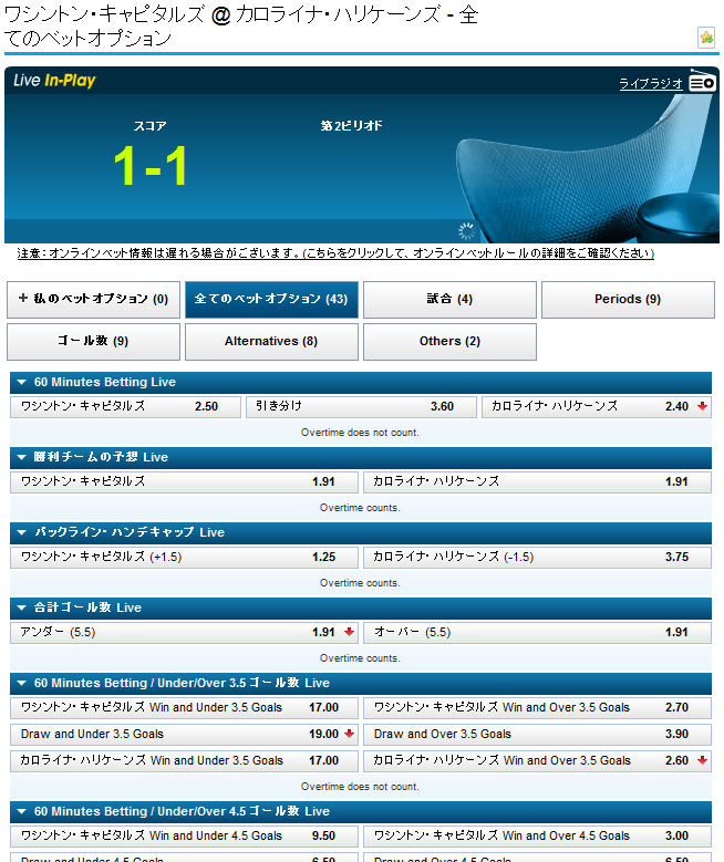例えばこれは第二ピリオドの中盤に差し掛かった時の合計ゴール数ですが、まだ1−1で残り時間が半分しかないため、アンダーのオッズが下がりオーバーのオッズが上がりました。