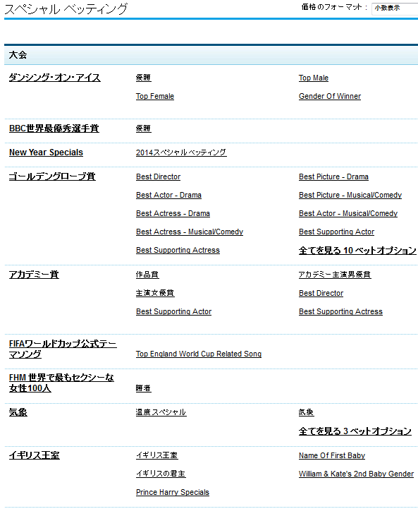 Andy Murray と Kim Searsは結婚するかとか、有名人のカップルで最初に分かれるのはどのカップルかとか、ウィリアム王子とケート王妃に第二子は産まれるかなど、イギリスでバラエティーに取り上げられそうなことが賭けの対象になっています。