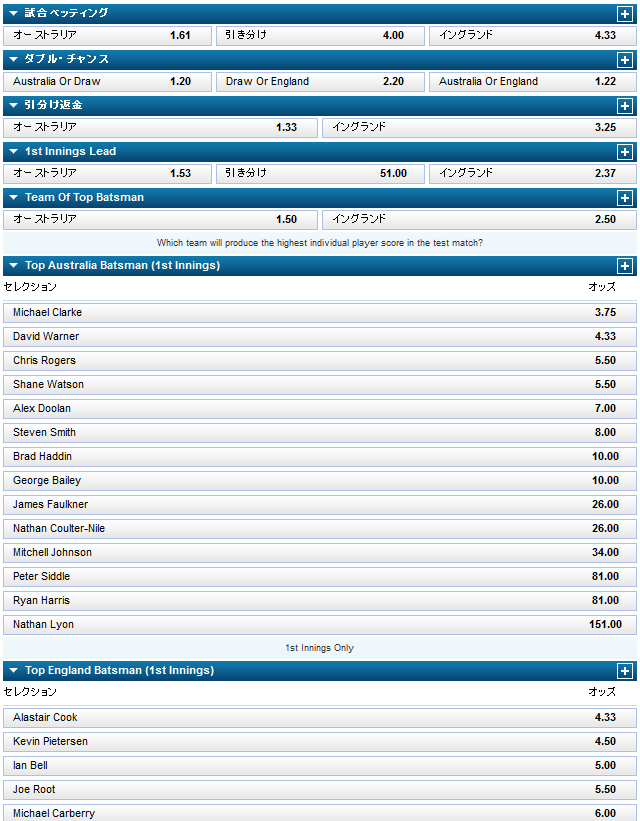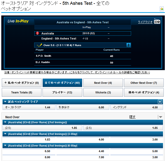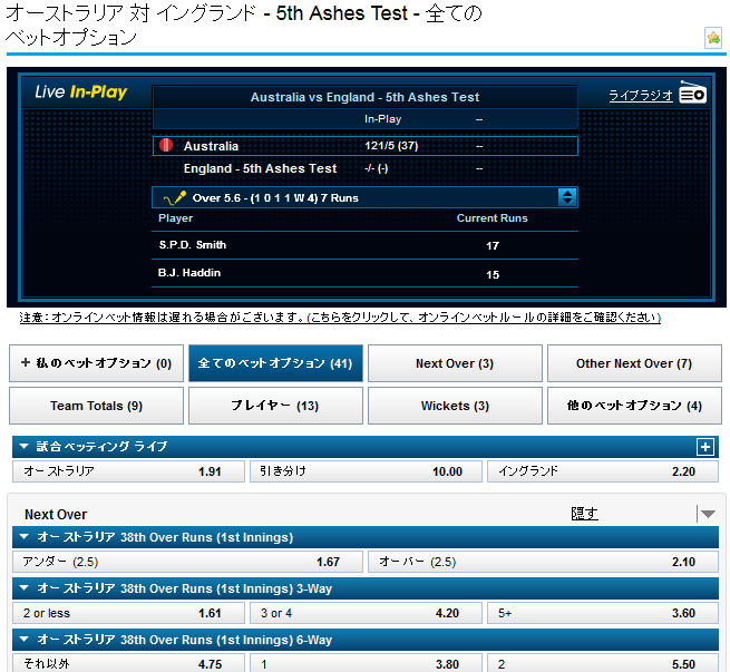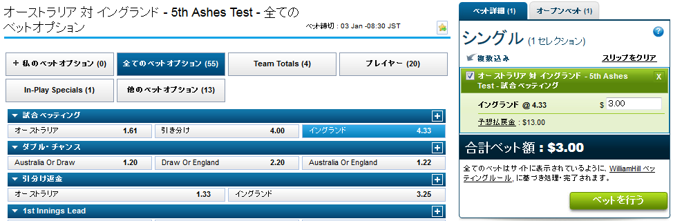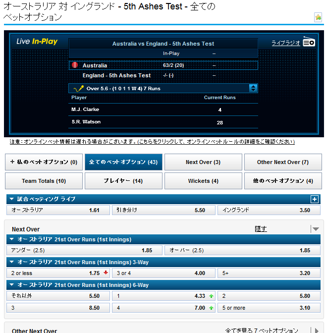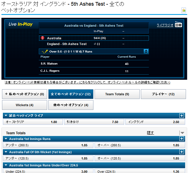 今回はジ・アッシズ - 5th Testのオーストラリア対イングランドを例に取ろうと思います。
