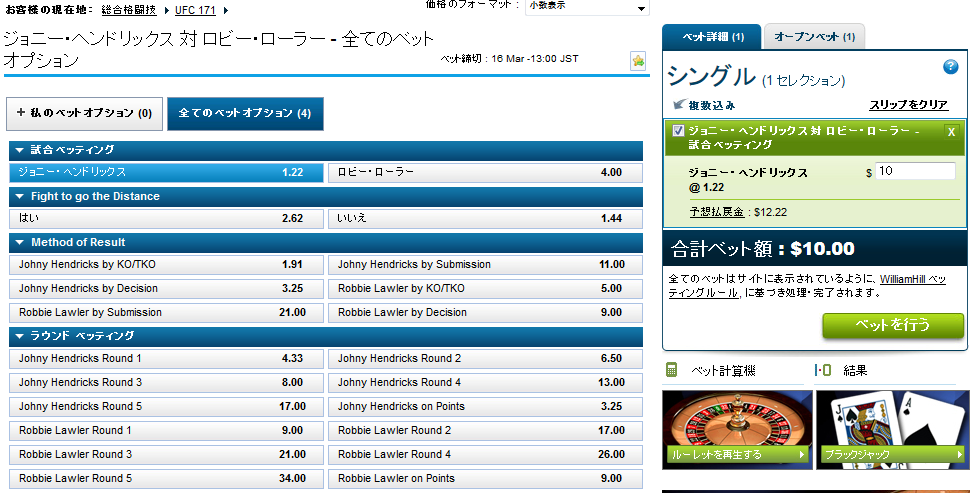 総合格闘技のベッティングについて説明します。今回はUFC171のジョニー・ヘンドリックス対ロビー・ローラーを例に取ります。総合格闘技は4つしかベットオプ...