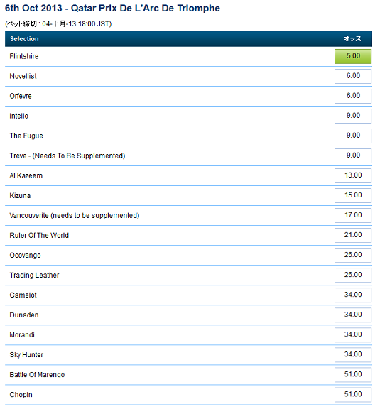 2013凱旋門賞のオッズはオルフェーヴルがフォア賞を制したことにより一番人気になりました。(2013.9.16現在)