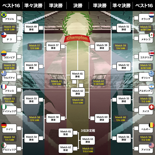 公式ホームページのサッカー2014 FIFAワールドカップより確認することができます。