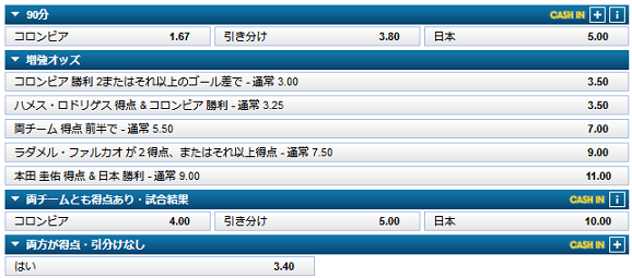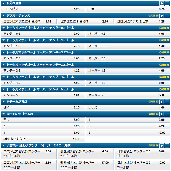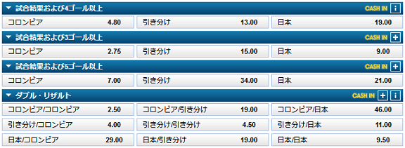 過去の対戦成績をみてもコロンビアには0勝1分2敗とまだ勝ちがないのですから、このオッズも妥当かと思われます。