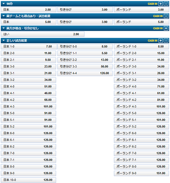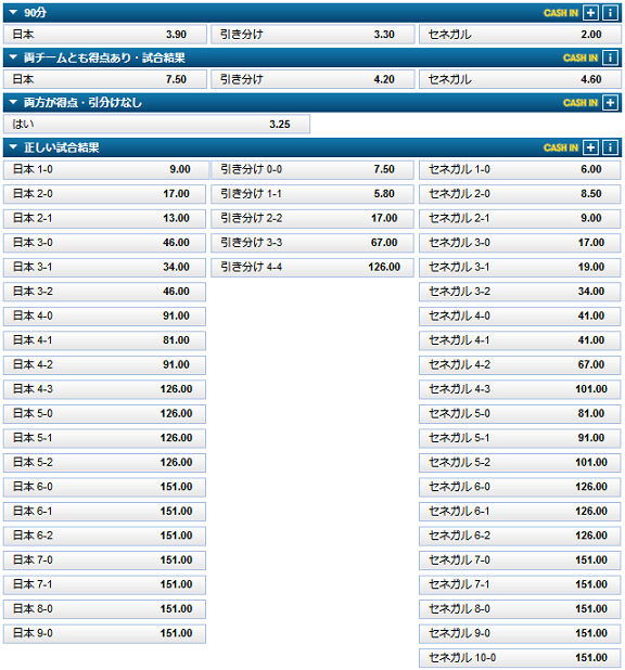 90分のマーケットは日本勝ち3.9倍、引き分け3.3倍、セネガル勝ち2.0倍となっています。