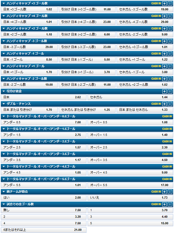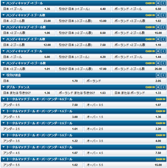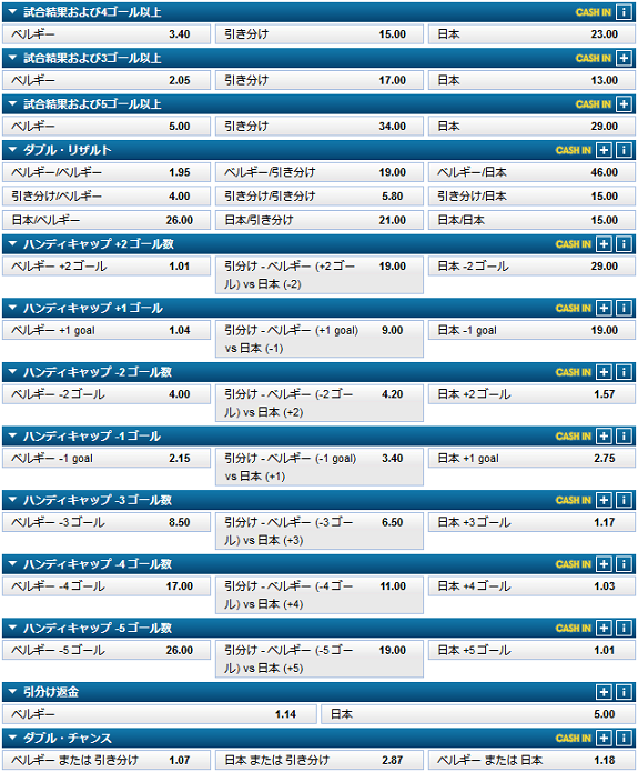 これがその他のマーケットです。日本に+1のハンディを与えたら、ひっくり返るくらいのオッズ差ですので、やはり拮抗した試合を予測しているのが伺えます。2018.6.25 更新