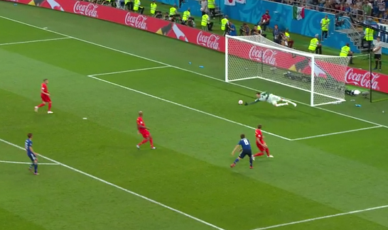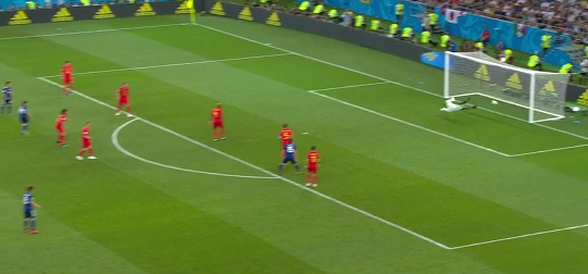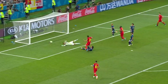 その後2点を入れられ追いつかれ、後半延長に突入するかと思われた瞬間、クライマックスを迎えました。本田のコーナーキックをクルトワがキャッチすると、すぐに前方のデブライネにスルーパス、デブライネの前には広大なスペースが空いていました。見方にパスをせずにそのままドリブルでトップスピードになり、山口の少し前で右前方へ放り込みました。そこへ走っていたムニエがゴール前へ転がし、ディフェンダーを十分に引きつけたルカクがスルーし、その後についていたシャドリがたたき込みました。見事なカウンターで名ゴールだったと思います。