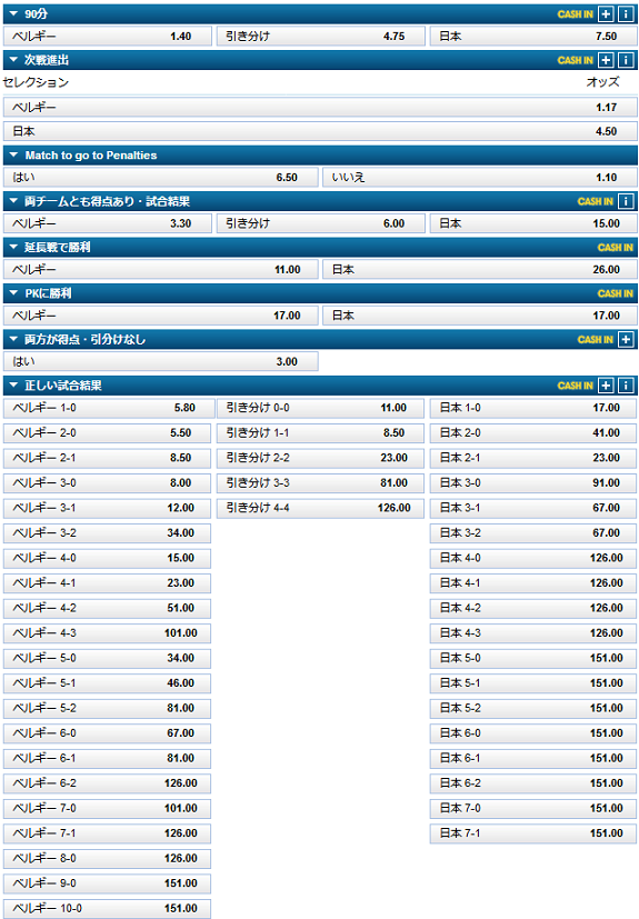 決勝トーナメント1回戦8試合の中で最もオッズの勝利チームオッズの乖離が大きく、大方ベルギー有利を予想しています。正しい試合結果は2−0でベルギー勝ちを本命にしています。このオッズを見ると日本は90分で1点も取れないだろうと見ているようです。