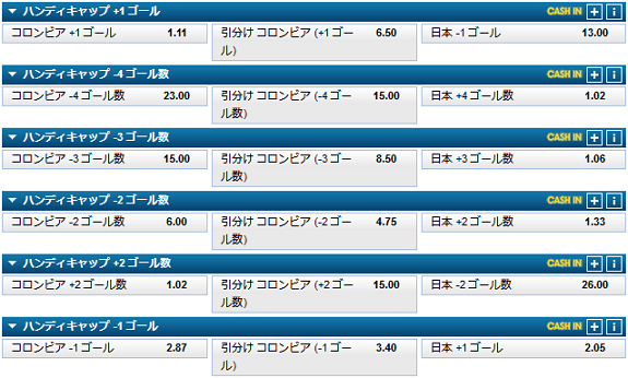 これはハンディキャップのマーケットです。注目してほしいのはコロンビアに-1のハンディを与えた場合は、日本の方がオッズが低くなっているという点です。これは仮にコロンビアが優位だったとしてもその差は1点もないことを意味します。