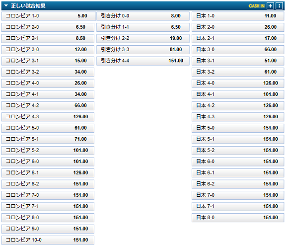 正しい試合結果をみてみますと1-0でコロンビア勝ちが5倍と最も人気が高く、2-0でコロンビア勝ちと1-1の引き分けの6.5倍がそれに継いでいます。僅差のゲームながら接戦でコロンビア勝ちが、最も有力視されているのが伺えます。