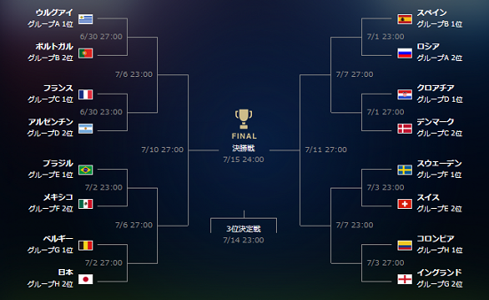 これが決勝トーナメントです。日本の初戦はグループGを1位で通過したベルギーと対戦します。ベルギーはFIFA世界ランク3位です。