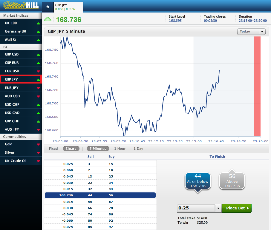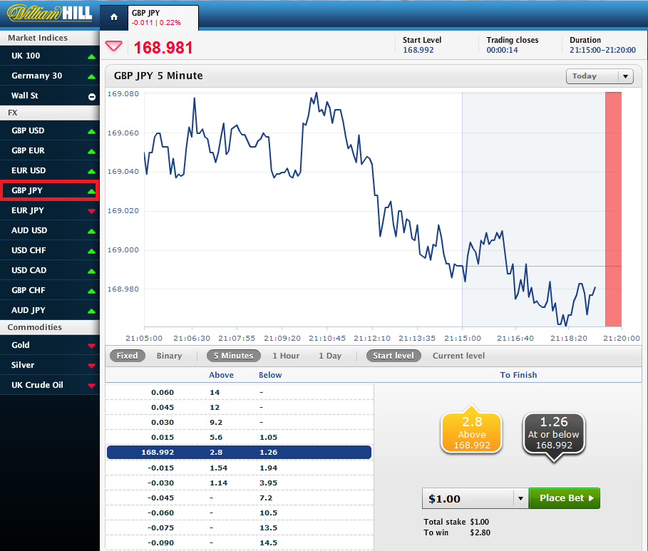 21:15〜21:20分までの取り引きで、21:20分に168.992ポンドより上に買えばオッズは2.8倍になり、168.992と同じか下に買えばオッズは1.26倍となります。
