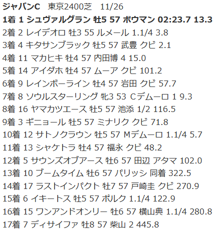 非常に僅差ながら1着はシュヴァルグラン、2着はレイデオロ、3着はキタサンブラックでした。常にリードをしていたキタサンブラックが直線になっても先頭で、これは逃げ切るかと思いきや、シュヴァルグランとレイデオロが追い越しました。最後今一伸びなかったキタサンブラックは、どうやら左前脚が落鉄していたそうです。しかしジャパンカップらしい見応えのあるレースでした。期待に違わない内容だったと思います。